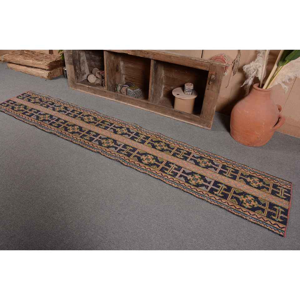 Tapis Vintage en Laine Turque 17X9,6 pieds Bleu et Beige Patchwork Design Plat Tissage Technique pour Décorations de Salon