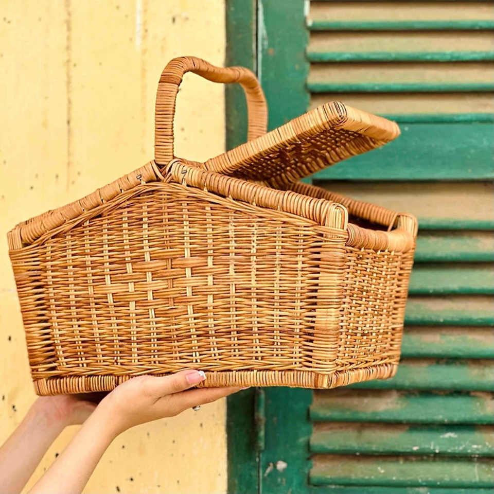 Panier de pique-nique en rotin en osier vintage avec couvercle du Vietnam, grand panier de récolte en osier, pique-nique de jardin léger