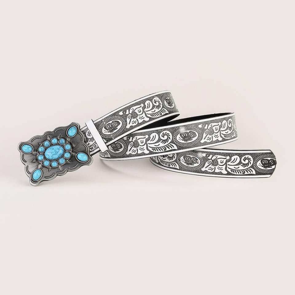 Ceinture large bleu turquoise pour femmes Vintage Style ethnique boucle carrée en alliage Design occidental simple fabriqué au Pakistan en cuir véritable PU