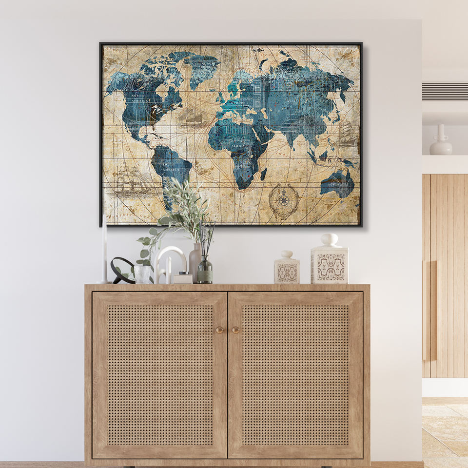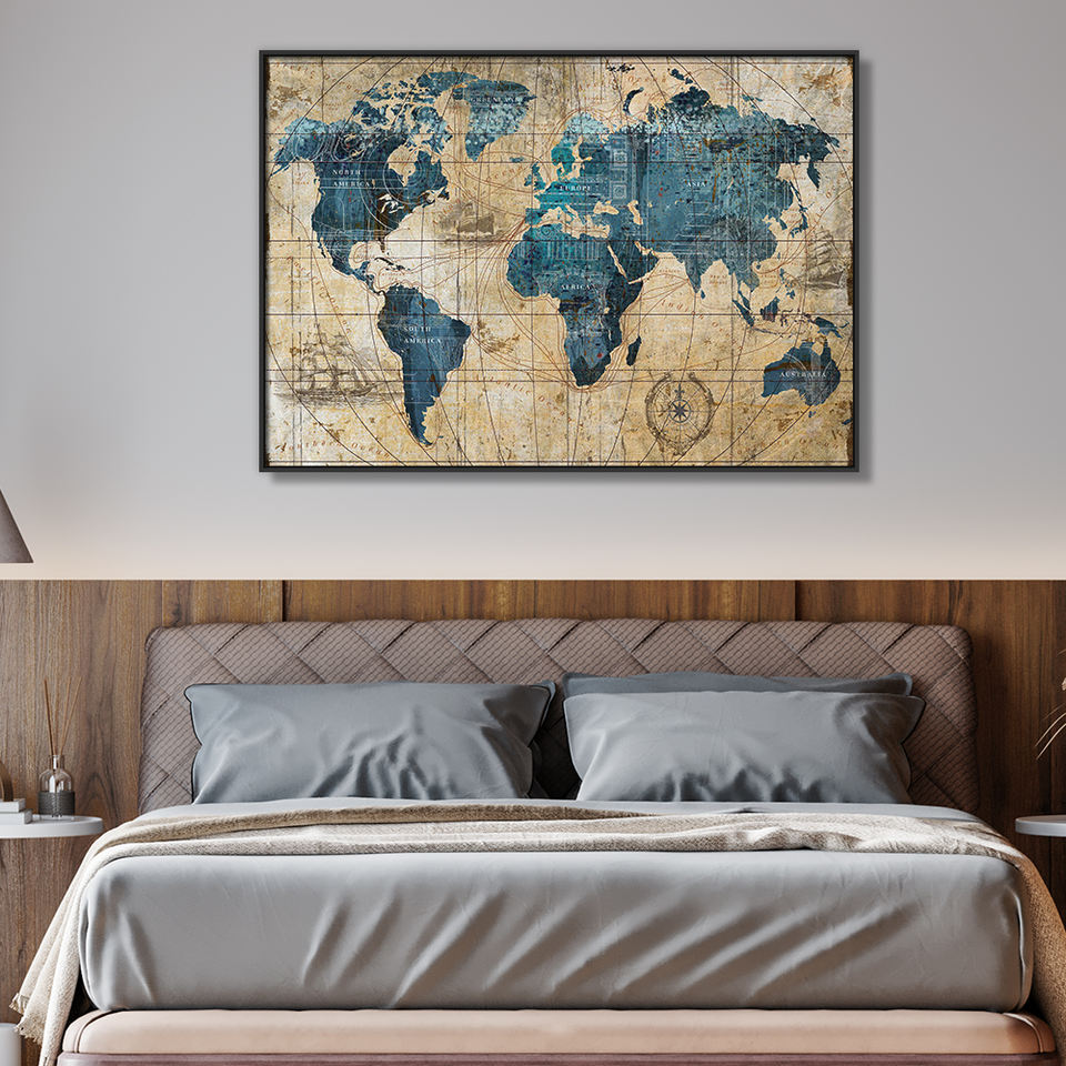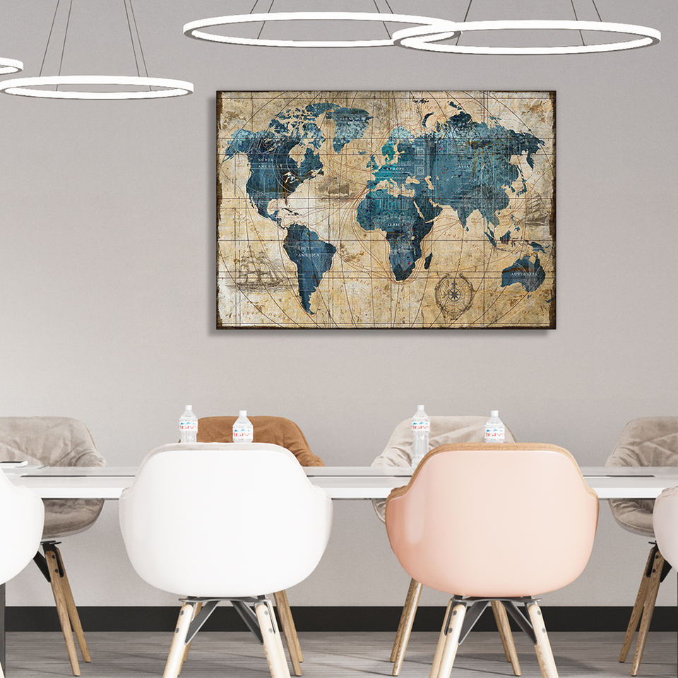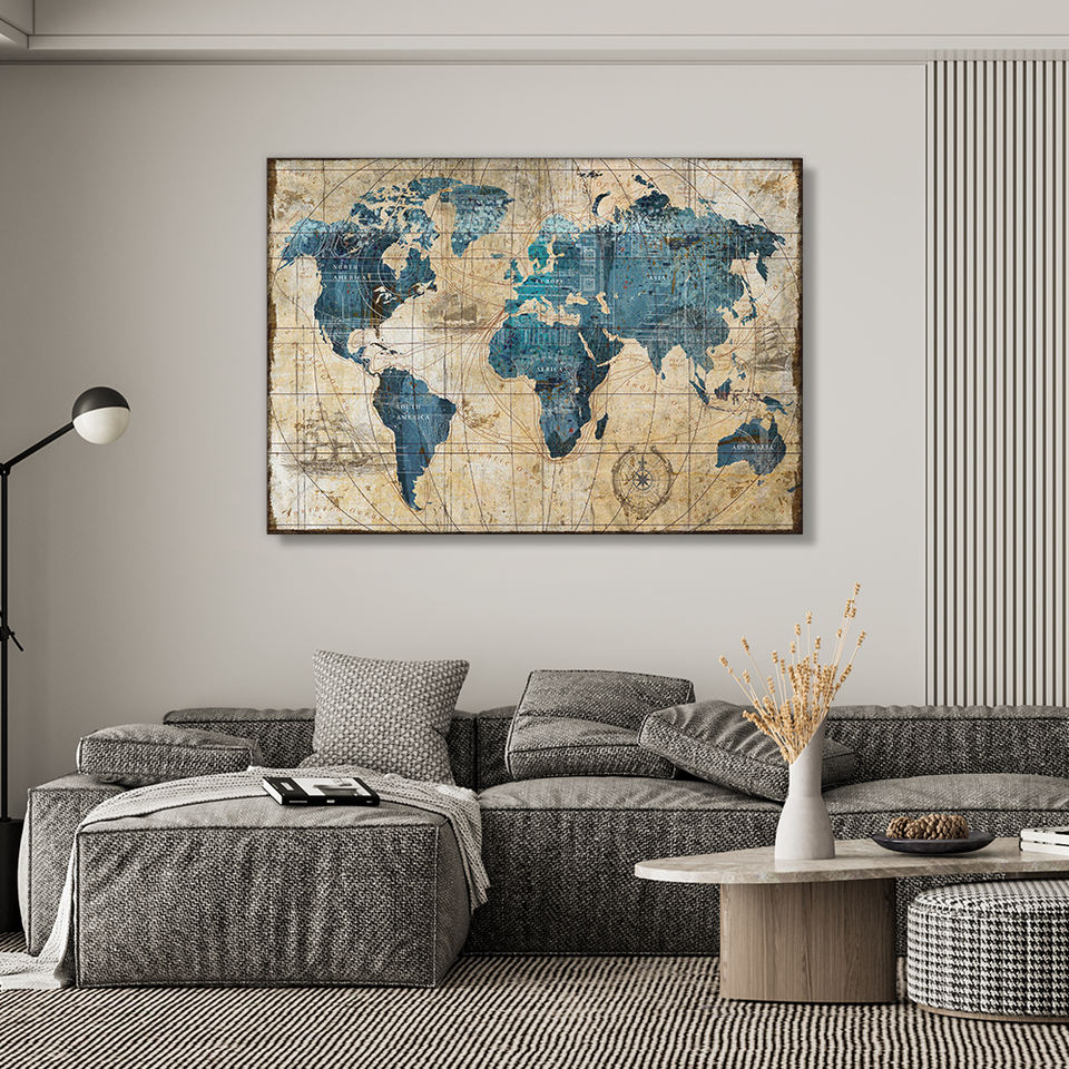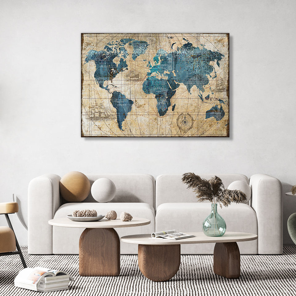 Peinture sur toile vintage de la carte du monde, art bleu, culture, voyage, globe, monument, affiche, impression murale, image pour le salon, le bureau