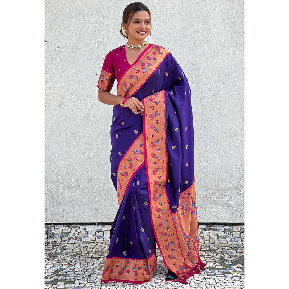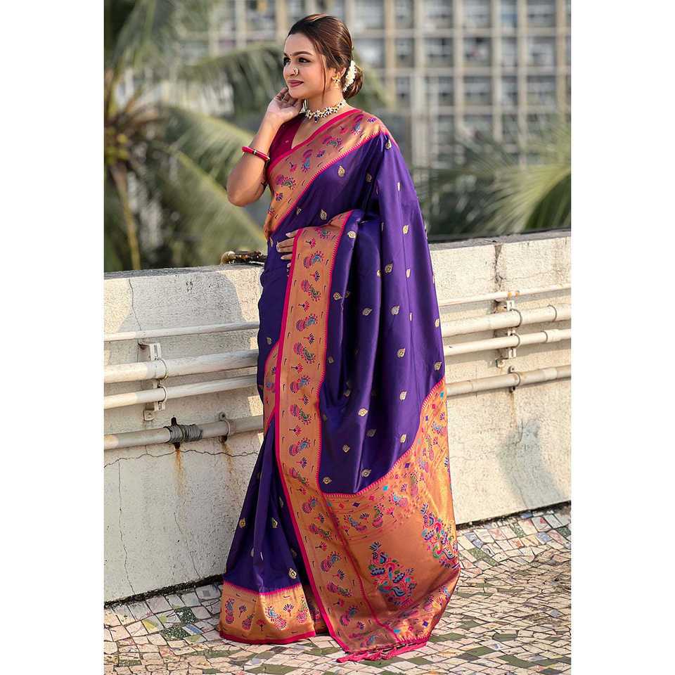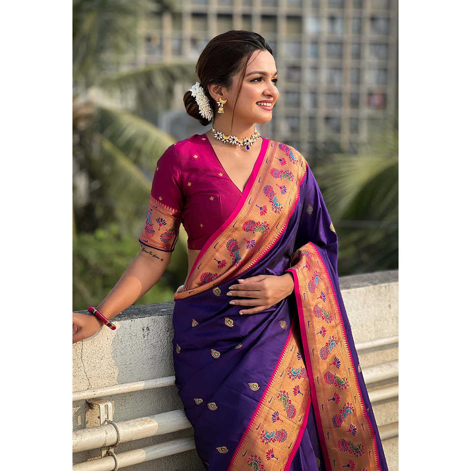 Violet Zari Woven Tiny Nath Meenakari Contrast Yeola Paithani Silk Saree Elegant Evening Dresses