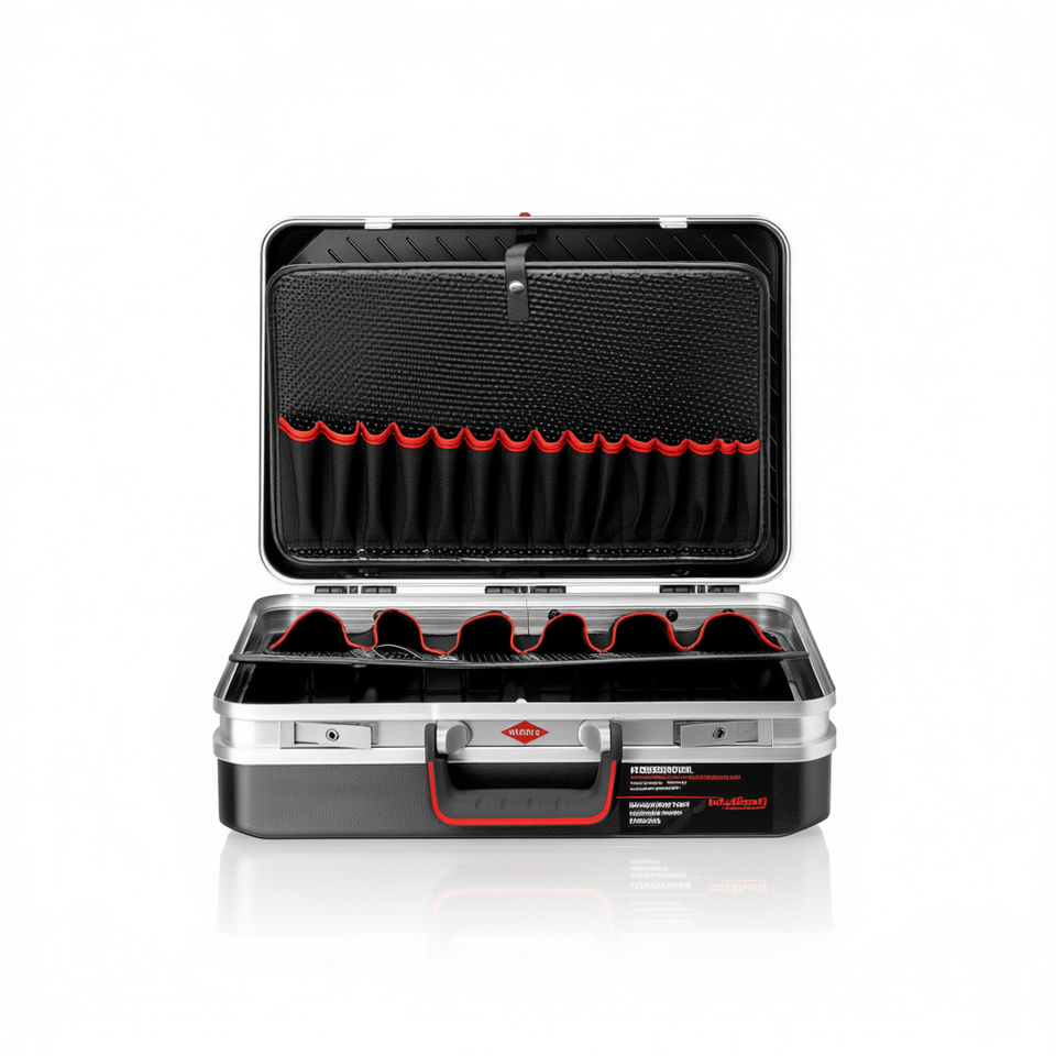 Mallette à outils Vision24 avec garniture rouge et poches organisatrices pour le rangement et le transport