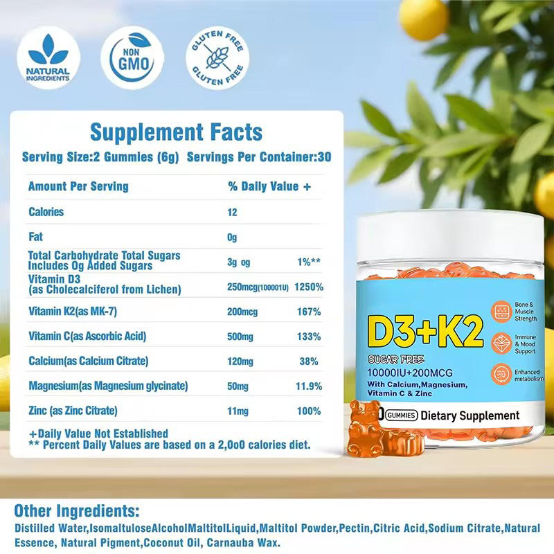 Complément alimentaire en gommes à la vitamine D3 K2 pour soutenir la santé des os, l'absorption du calcium, la santé immunitaire avec du calcium, du magnésium, de la vitamine C et du zinc
