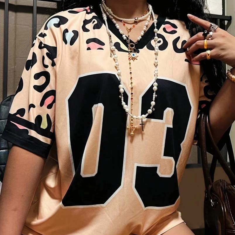 Viviblook Z407TP02 Printemps Été Nouveau INS Contraste Imprimé Léopard Numérique Col en V T-shirt Ample Col Rond Haut pour Femmes