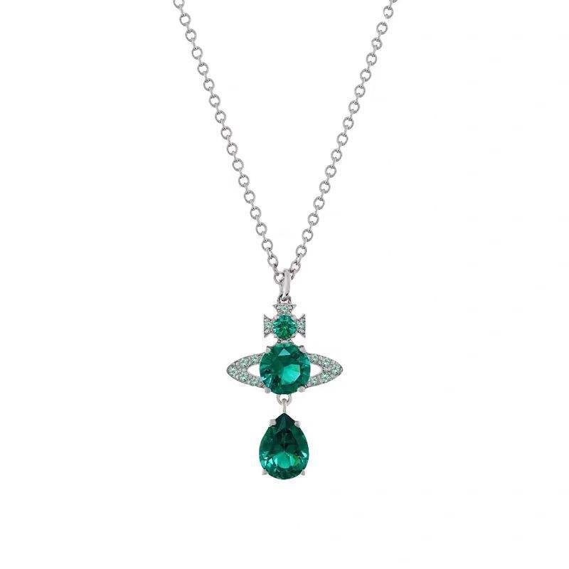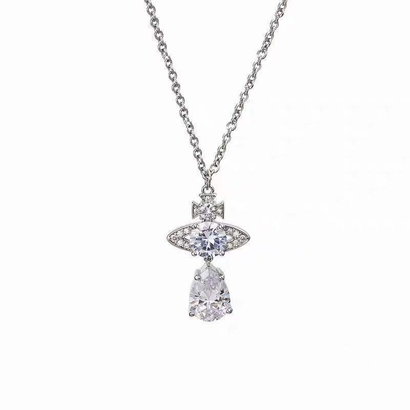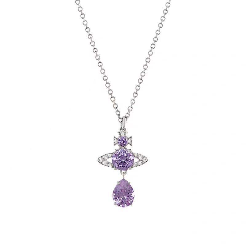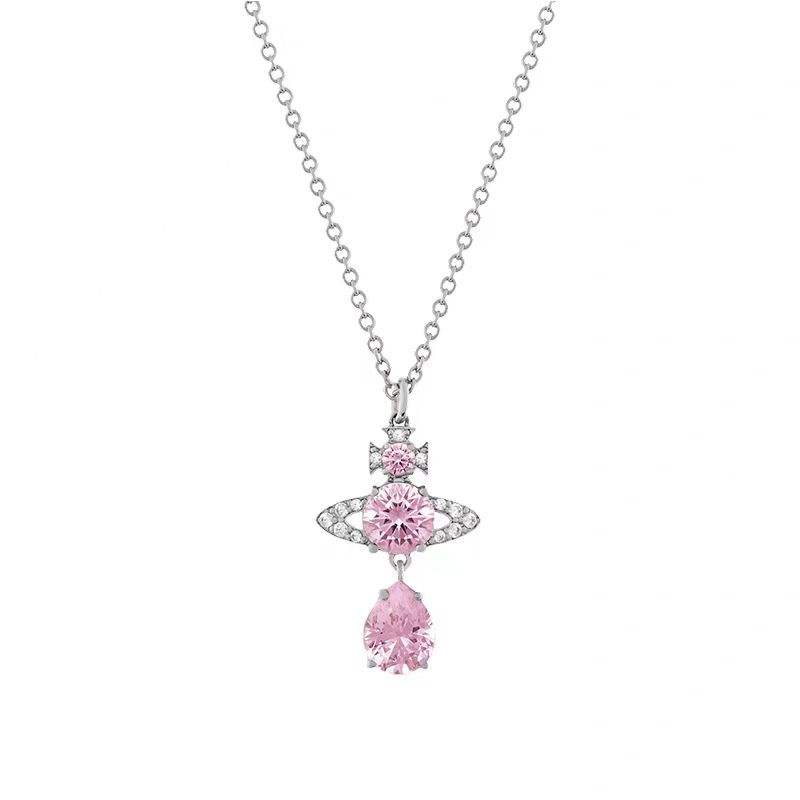 Collier Vivienne Larmes de Sirène Rouge Rose, Pendentif Saturne Zircon, Plaqué Platine, Argent 925, Chaîne Croisée, Bijoux Femme