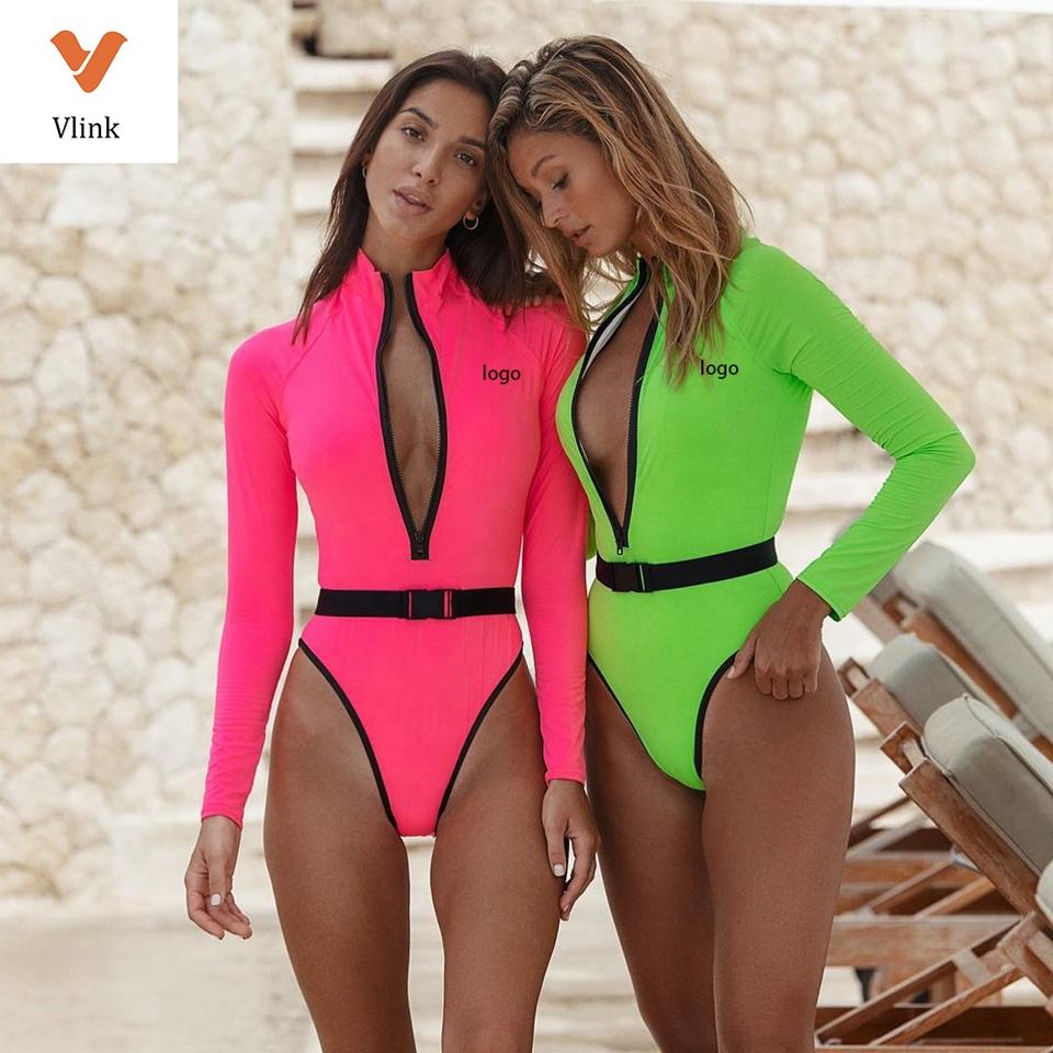 Vlink femmes OEM marque privée logo personnalisé maillot de bain une pièce à manches longues fermeture éclair avant col haut maillots de bain Sexy chaud Bikini