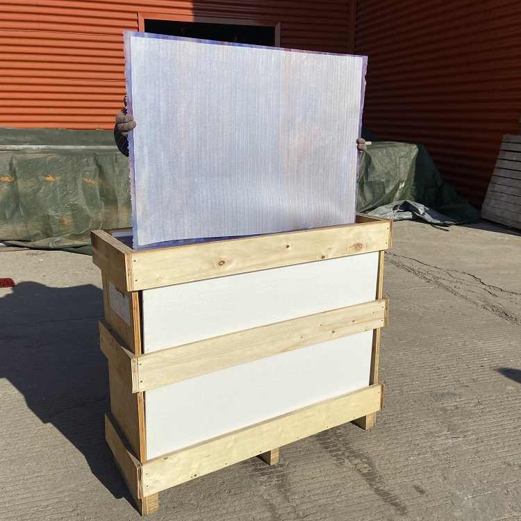 EPE mousse entre deux feuilles de verre et caisses en bois comme emballage extérieur.