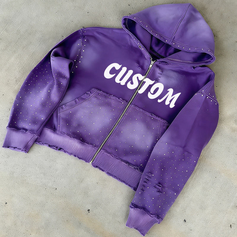 Sweat à capuche zippé violet personnalisable pour homme WASHED avec détails en strass, bords usés, style streetwear, coupe oversize, épais