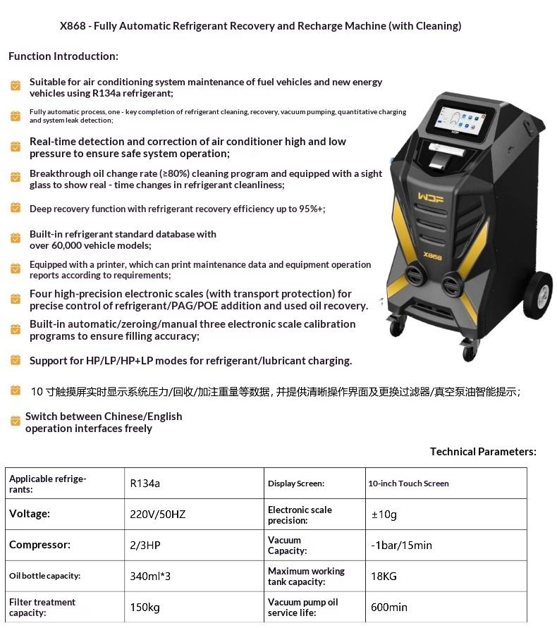 Machine de récupération de climatisation automobile WDF X868, outil de remplissage R134A, acier métallique, recyclage de gaz de climatisation, équipement de recharge pour l'entretien des voitures