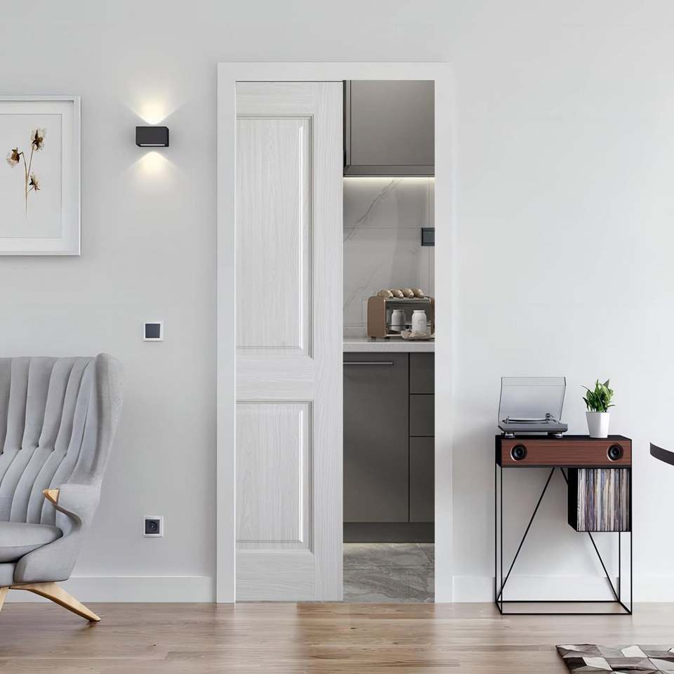 Système de porte coulissante WEKIS moderne avec cadre en aluminium ouvert, montants en bois recouverts d'acier, pour cuisine et salon