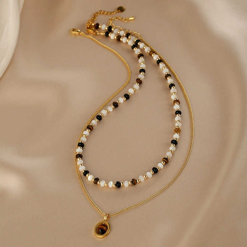 WENCHI Double Stacked Vintage Ladies Necklace with Fritillary Tiger's Eye Agate Pendant Fashion Layered Necklaces