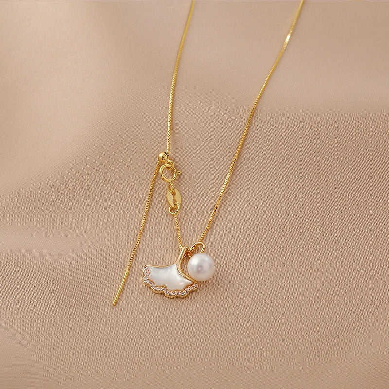 WENCHI Women's Ginkgo Biloba Necklace Exquisite Natural White Fritillary Design Elegant Pearl Jewelry