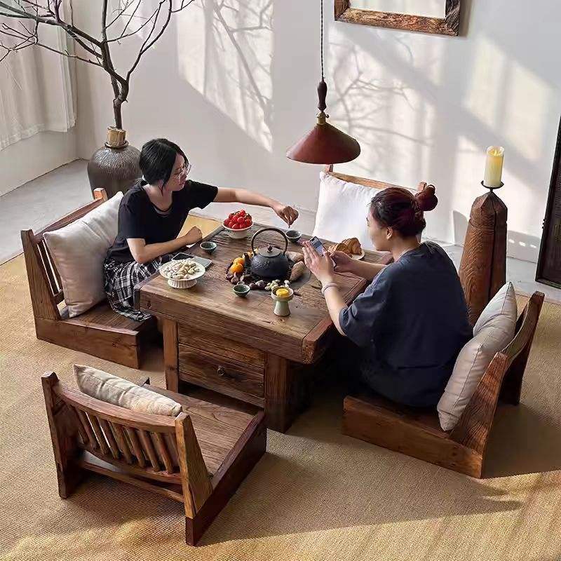 Table à thé carrée en bois d'orme Wabi Sabi pour extérieur, finition naturelle, style zen, table basse