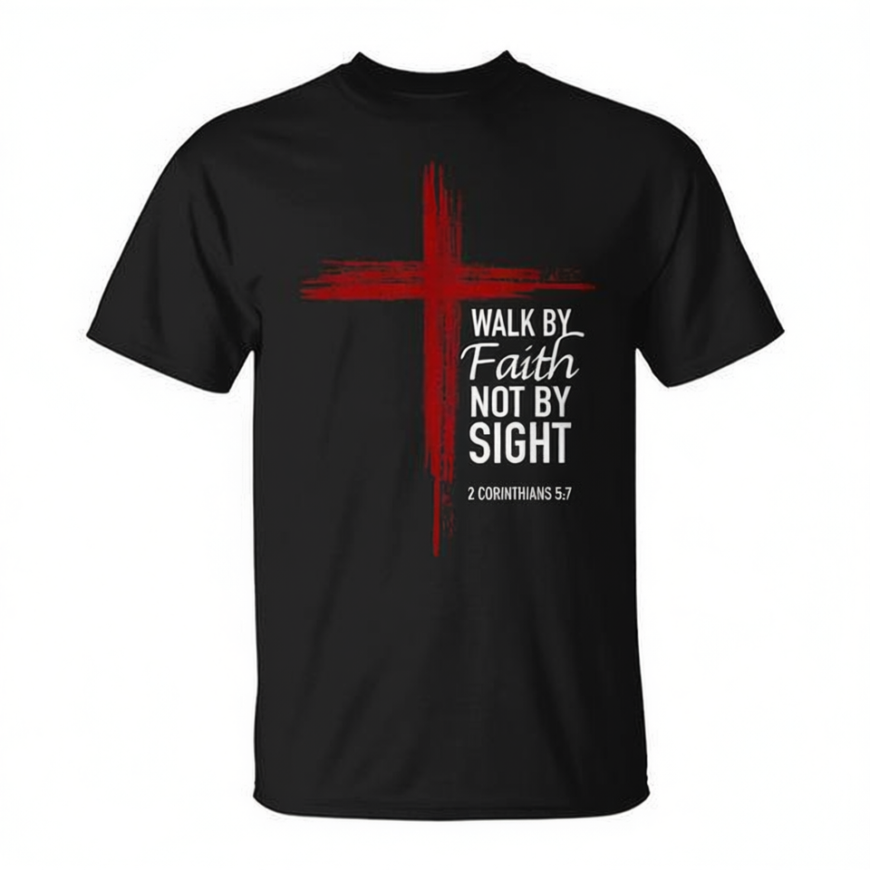 Marchez par la foi, non par la vue - T-shirt unisexe pour adulte avec impression sérigraphiée - Croix chrétienne - Verset biblique