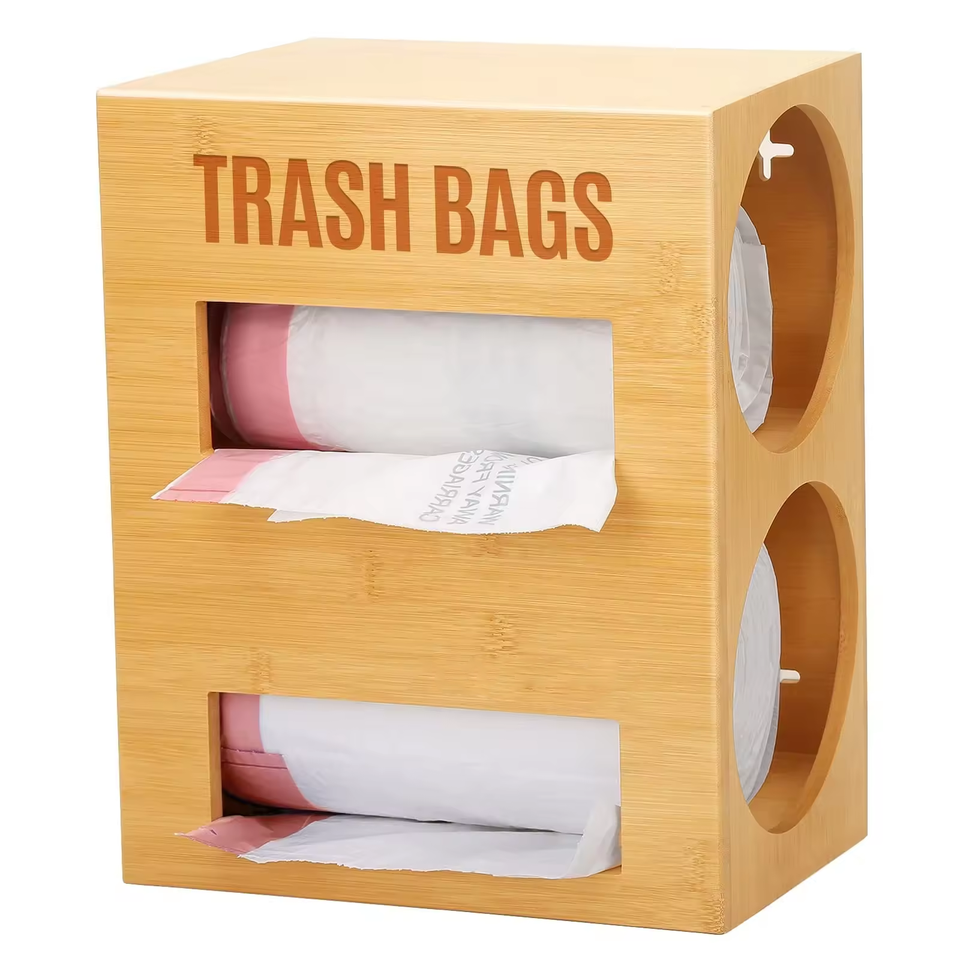 Distributeur de sacs poubelle en bambou mural et boîte de rangement, forme rectangulaire, organisateur 2 en 1 pour sacs poubelle, porte-rouleau en plastique