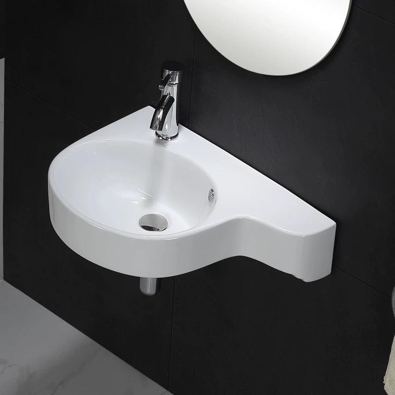 Lavabo en céramique monobloc mural d'angle gauche/droite, petit lavabo triangulaire irrégulier pour salle de bain d'appartement, salle à manger