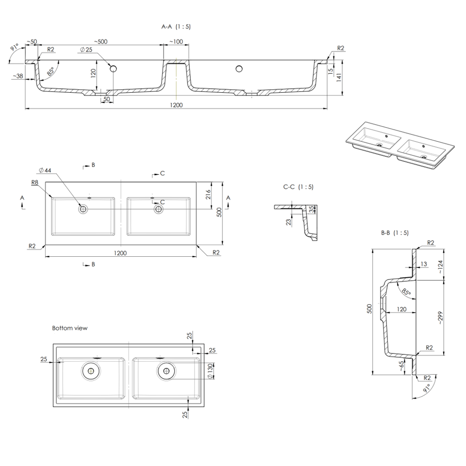 Lavabo double mural moderne en céramique avec finition mate 120 cm