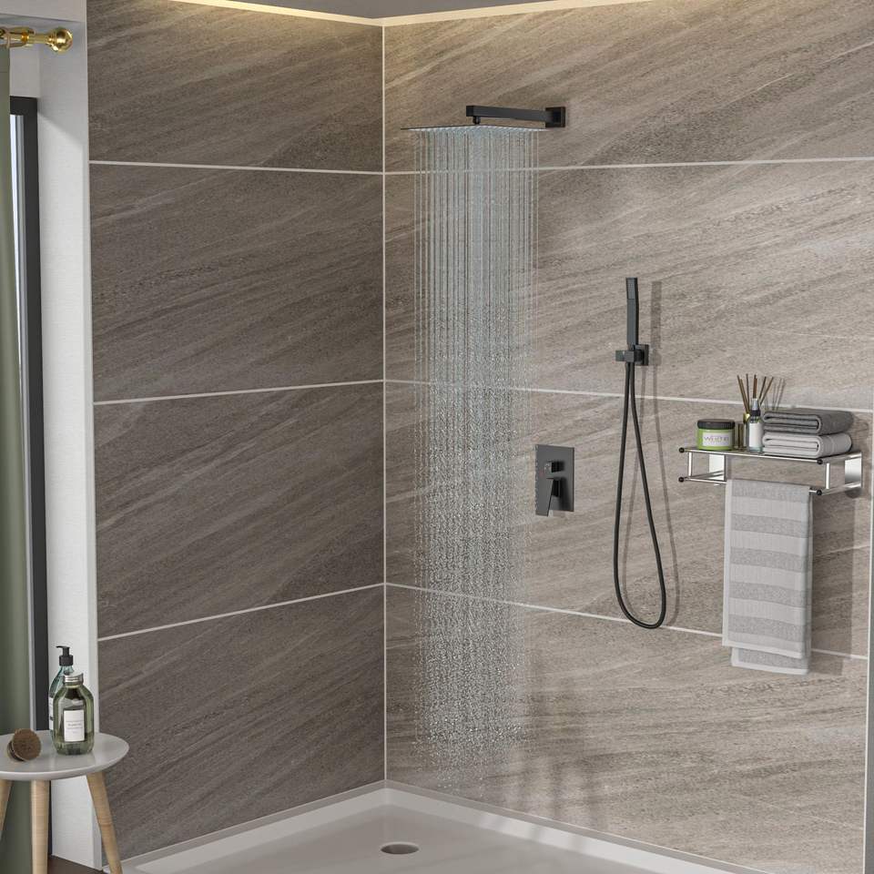 Système de douche mural carré double noir mat avec vanne intégrée, accessoires modernes pour salle de bain