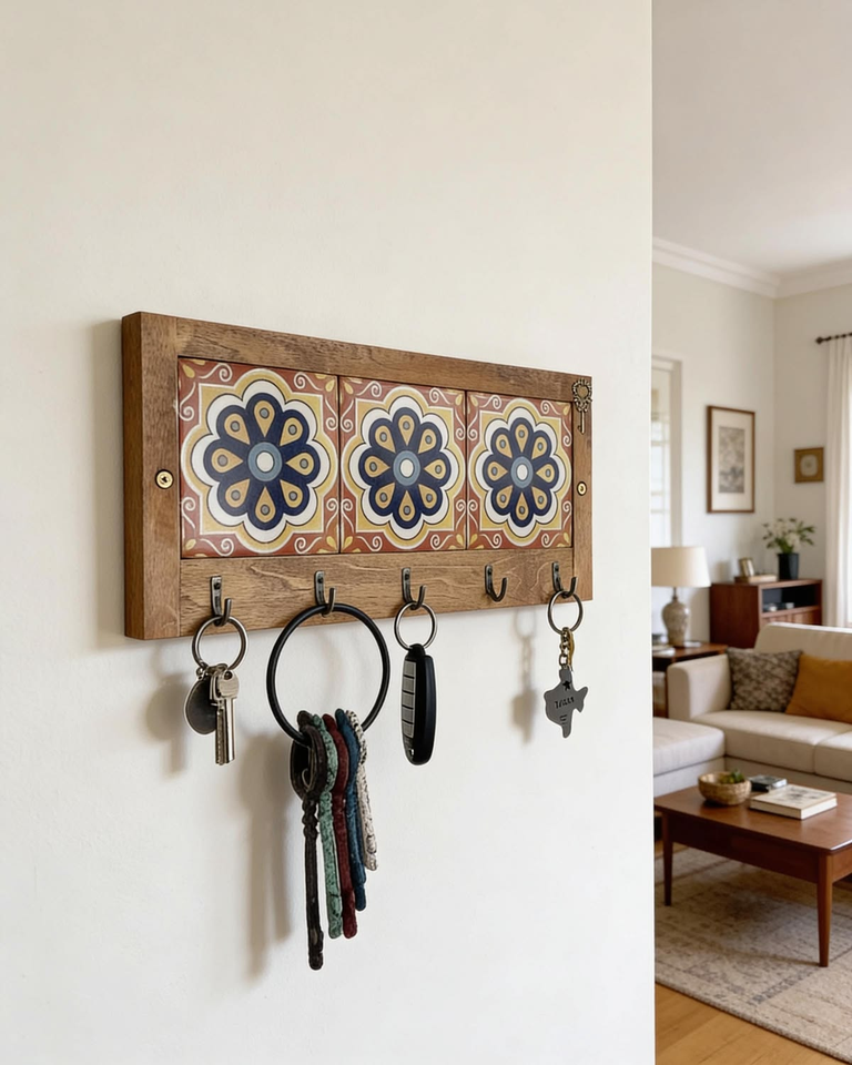 Porte-clés mural en bois avec finition rustique et crochets métalliques, support mural pour clés d'entrée en bois