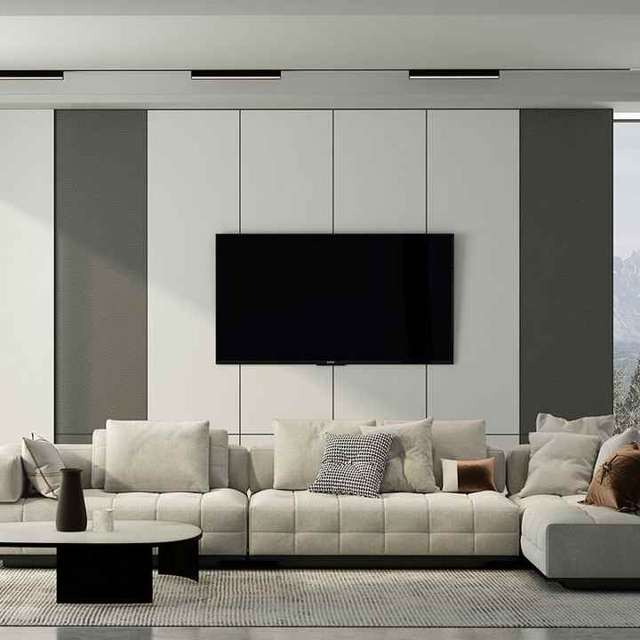 Meuble mural TV, design moderne, luxe, bois, salon, rangement, support TV, divertissement, LED, hôtel