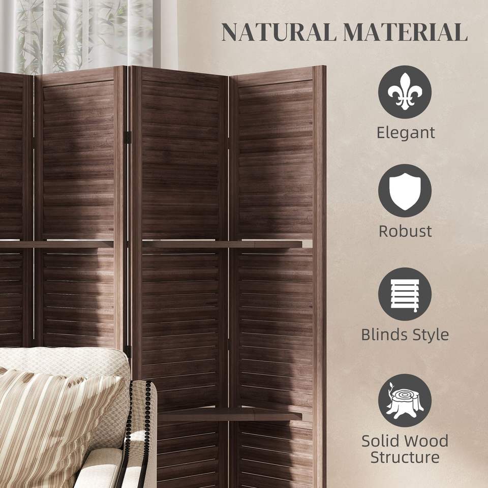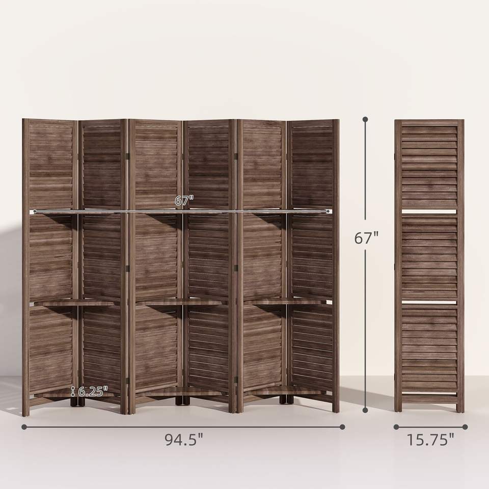 Paravent de séparation d'espace en bois de noyer de 67 pouces de hauteur avec 3 étagères et rangement pliable, produit à 6 panneaux pour chambre à coucher