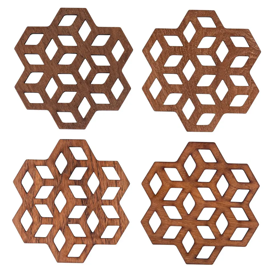 Sous-verre en noyer Dessous de verre en bois de teck fabriqués à la main Ensemble de quatre sous-verres en teck au design géométrique pour la décoration intérieure et la table