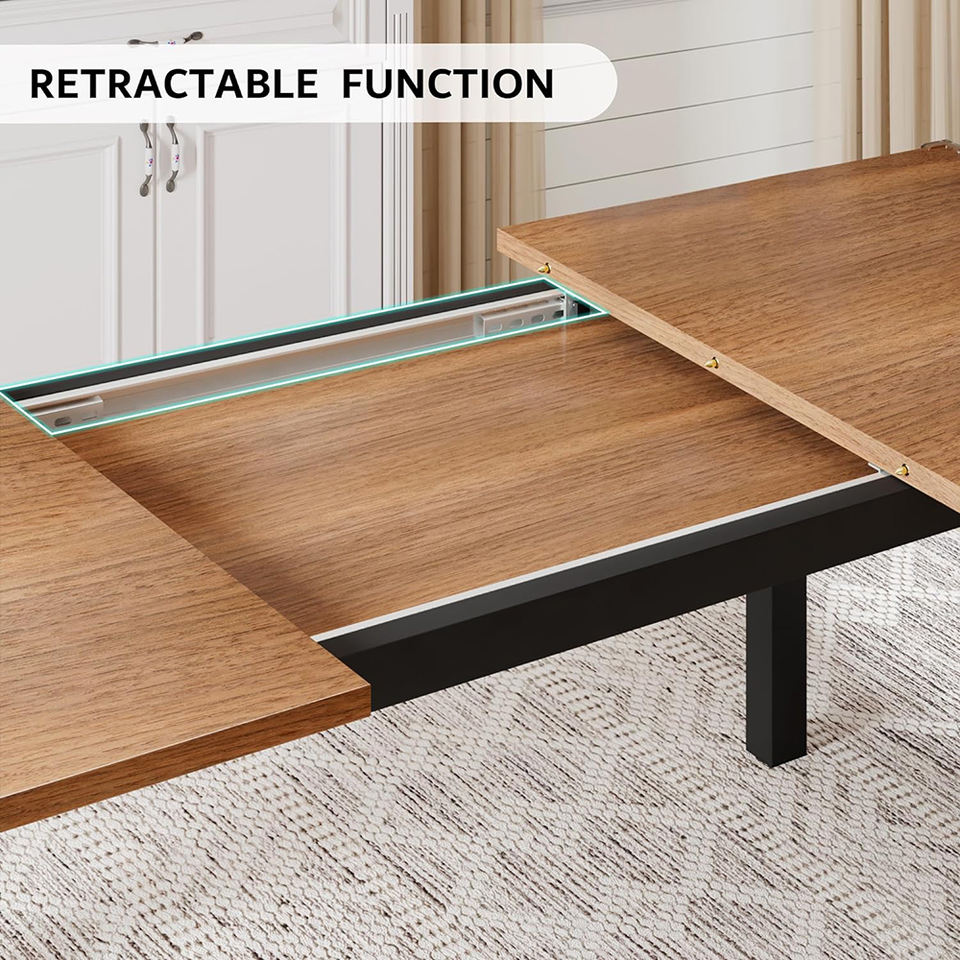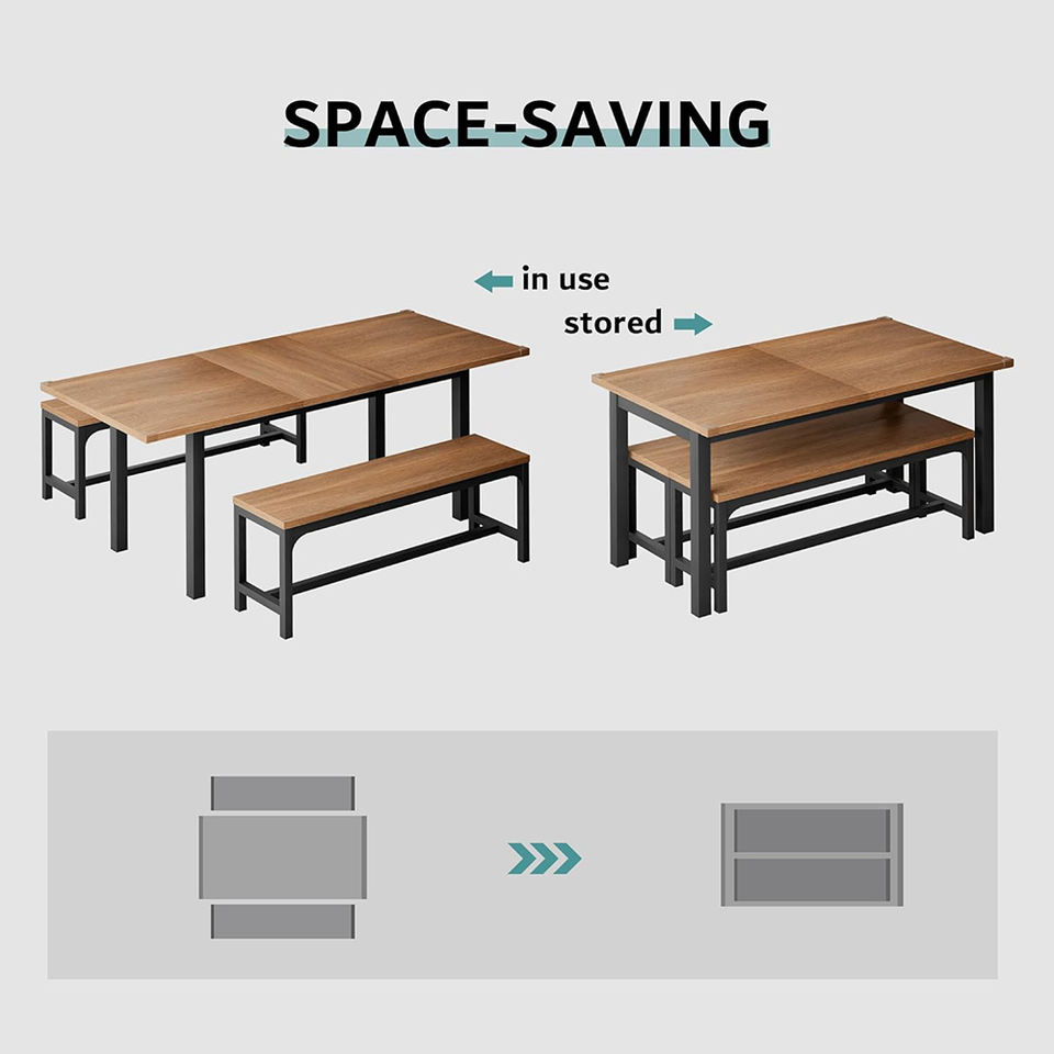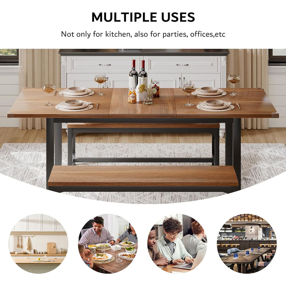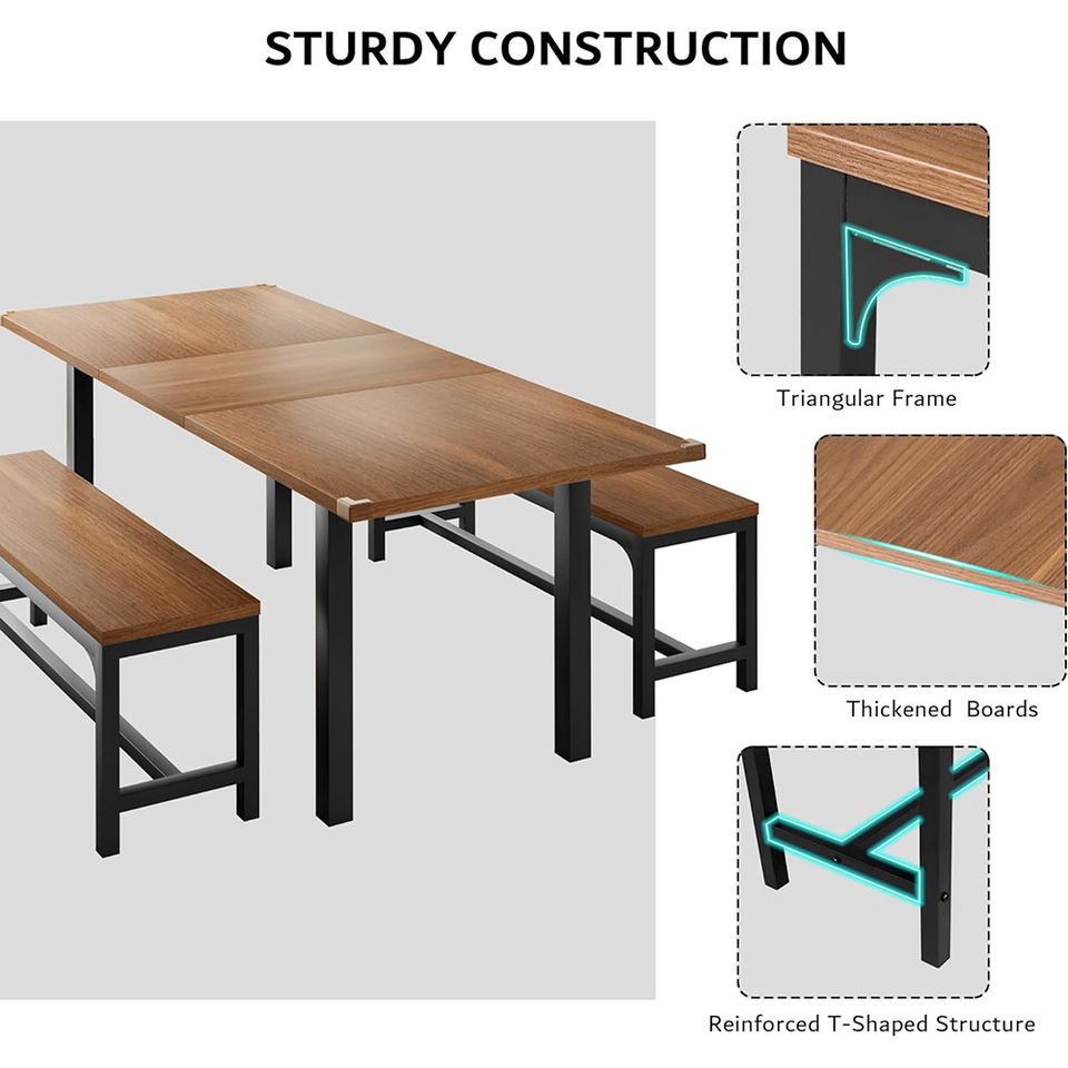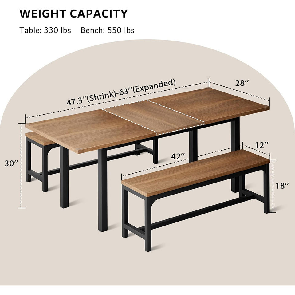 Ensemble de table à manger extensible en bois de noyer de style mid-century moderne, 3 pièces, avec 2 bancs