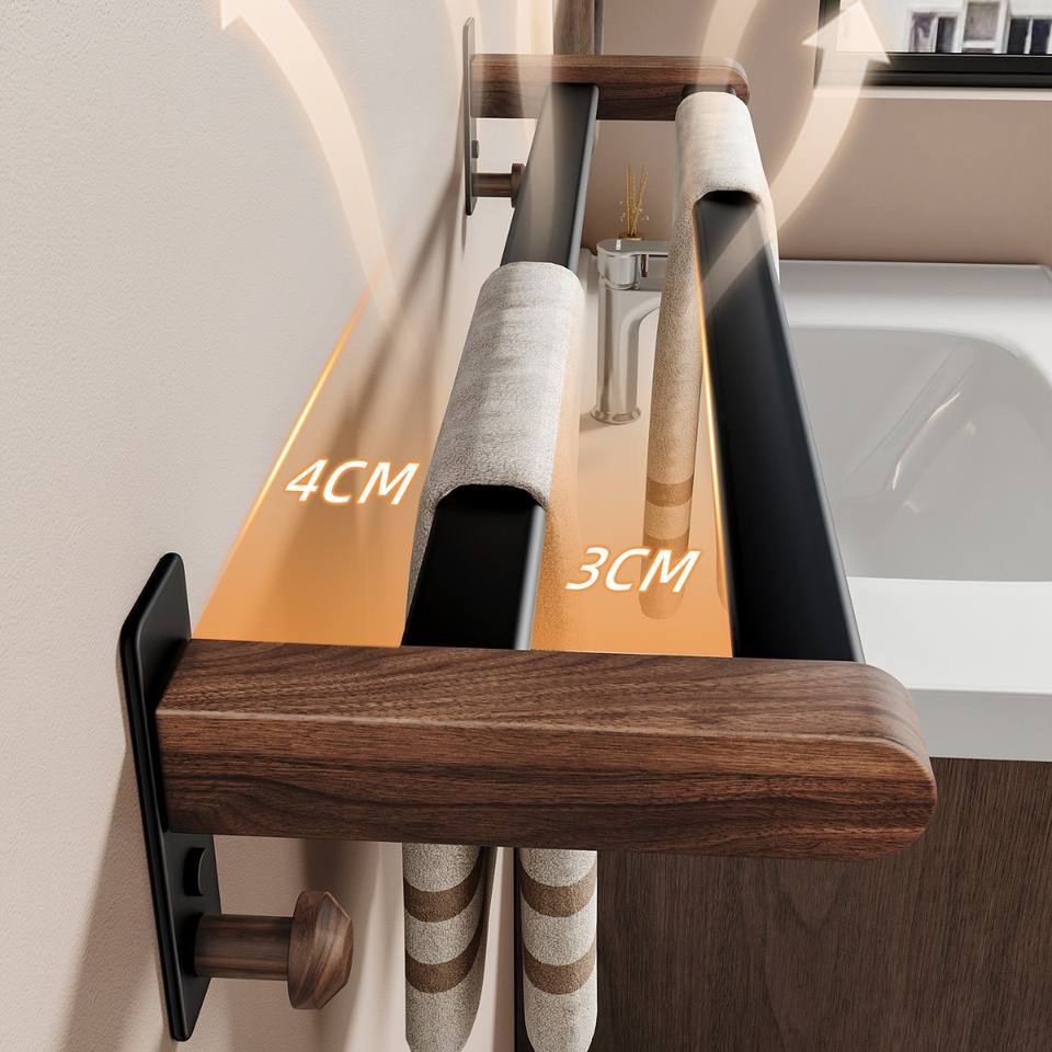 Porte-serviettes en noyer sans perçage, barre à serviettes de salle de bain, double barre, fixation murale, rangement pour serviettes de salle de bain, porte-serviettes suspendu
