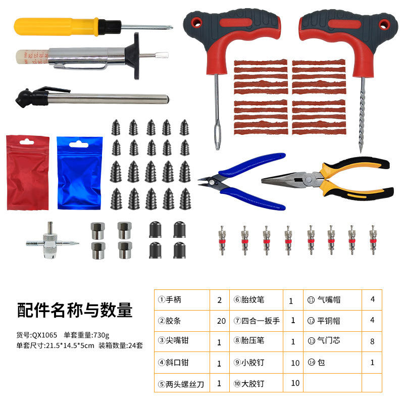 Specifications and Models:65pc tire repair kit, 96pc tire repair kit, 73pc tire repair kit
