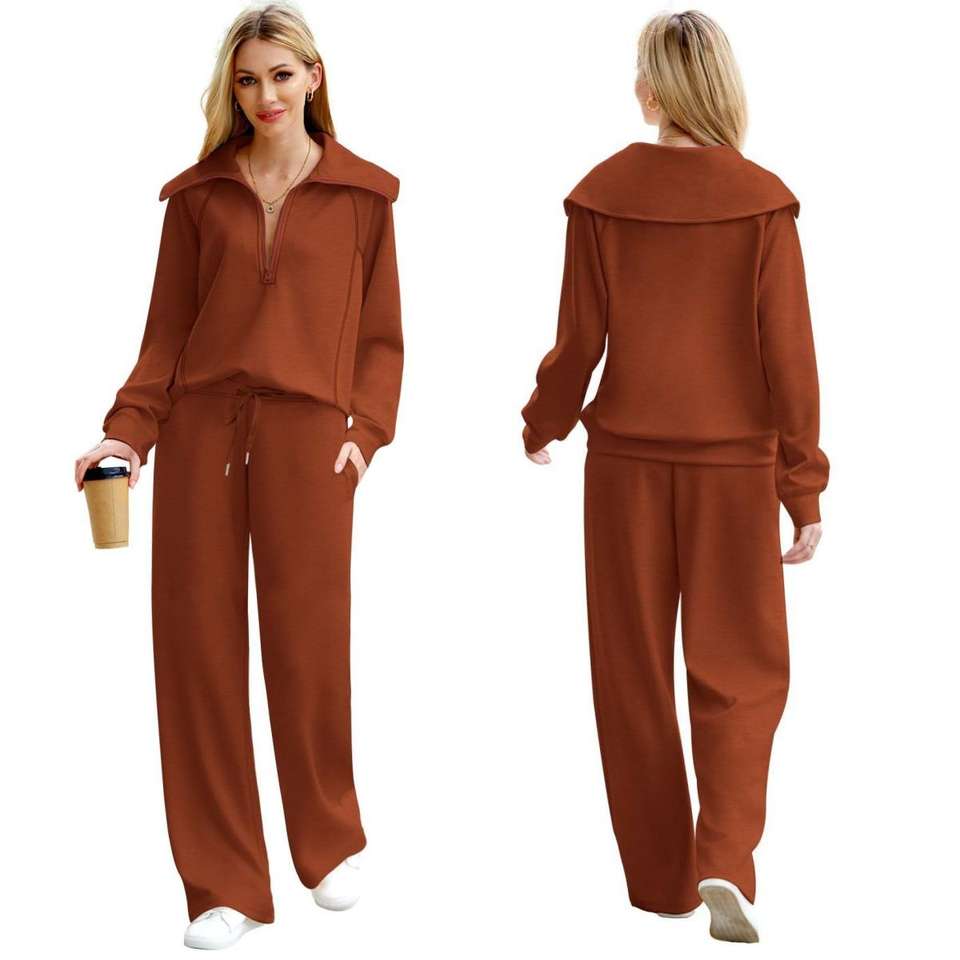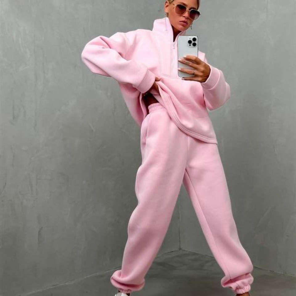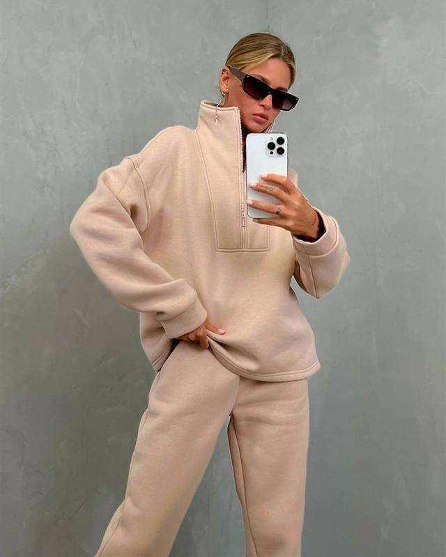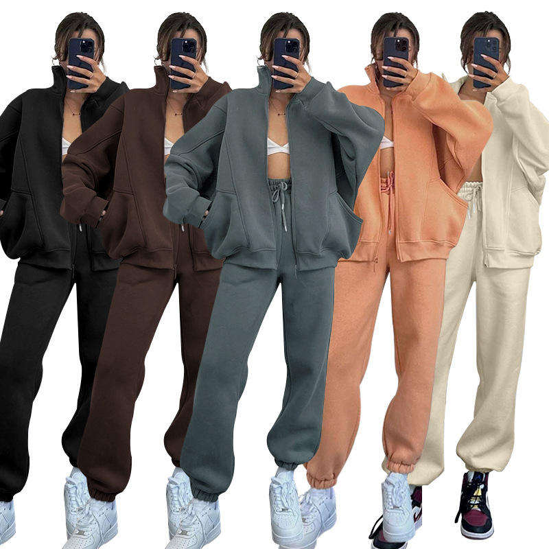 Ensemble de tenues chaudes unies pour femmes et hommes – Survêtements d'automne et d'hiver avec sweat-shirt à col montant zippé et pantalon