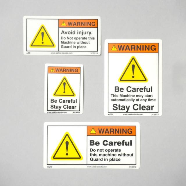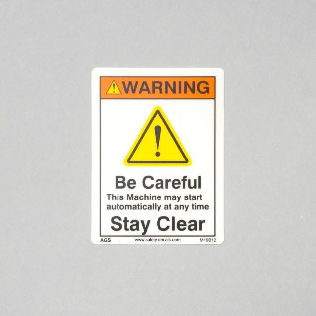 Avertissement : Attention, la machine peut s'activer automatiquement. Restez à distance. Autocollant de sécurité industriel M19, étiquette de conformité aux risques d'automatisation.