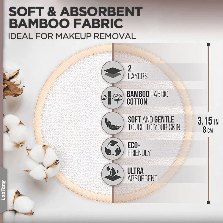 Tampons démaquillants ronds réutilisables en coton de bambou absorbant et lavable, 2 couches, avec sac de rangement