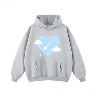 Sweat à capuche en molleton de coton surdimensionné gris clair lavé avec imprimé floral romantique de vignes, motif rose pastel doux et accent cœur