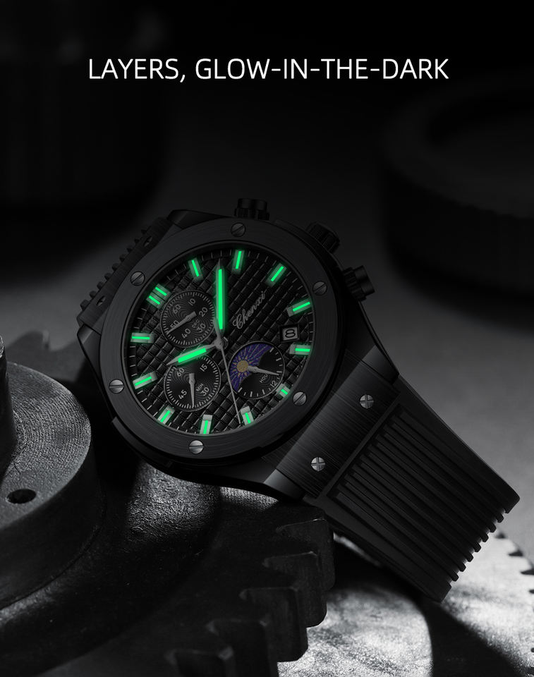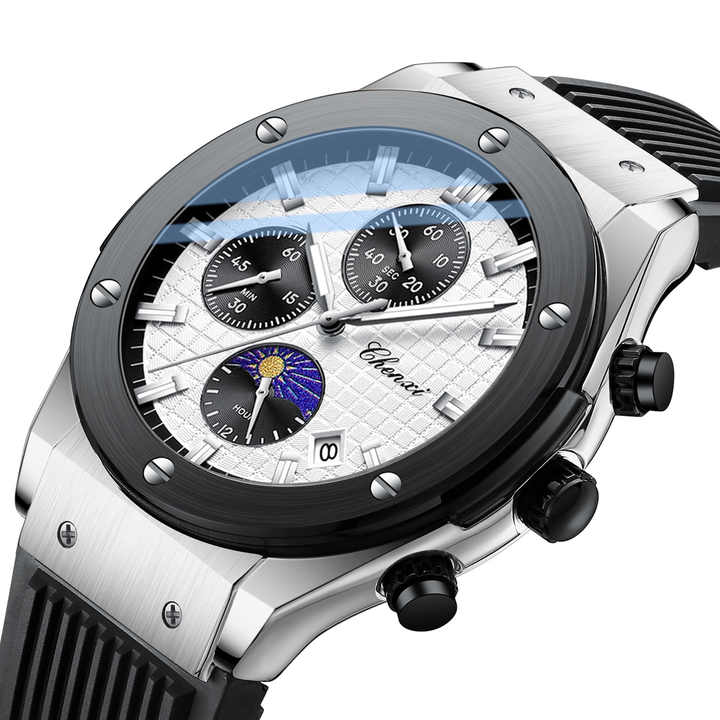 Fabricant de montres Montre lumineuse à grille superposée Texture Phase lunaire Montre chronographe à quartz en silicone pour hommes Style sportif