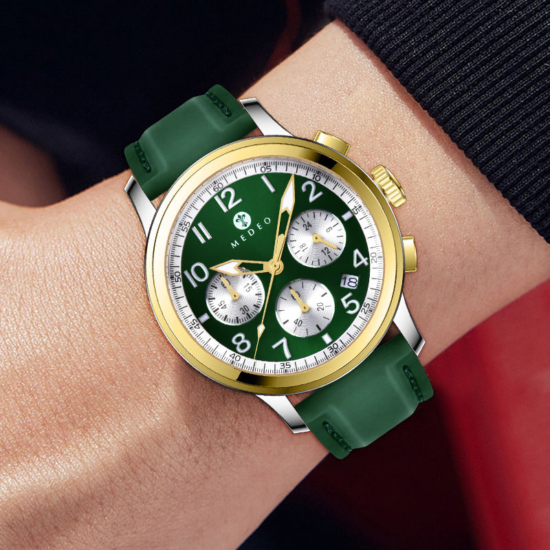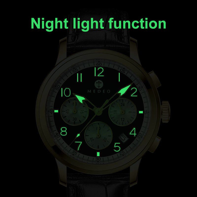 Dispositif:Alarme, Date automatique, Chronographe, Jour/date, Résistant à l'eau, Lumineux, Lumineux Mains, Chronomètre, Petit de trois aiguilles
