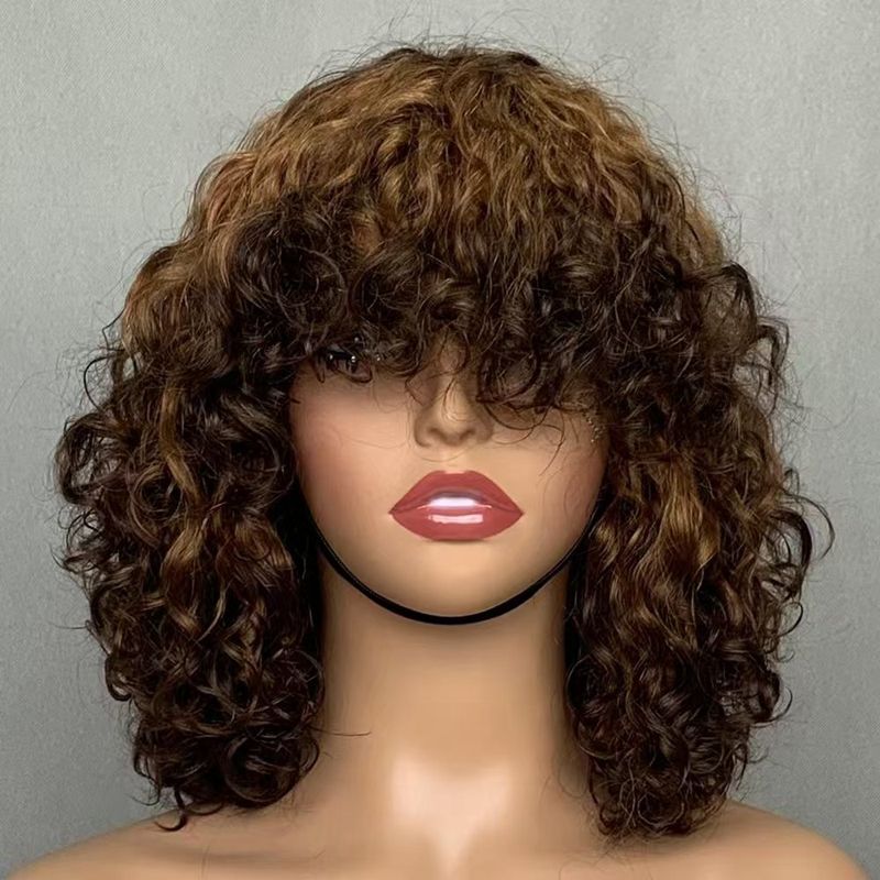 Perruque courte bouclée bob sans colle en cheveux brésiliens Remy Water Wave None Lace avec frange, densité 200%, fabriquée à la machine, pour femmes