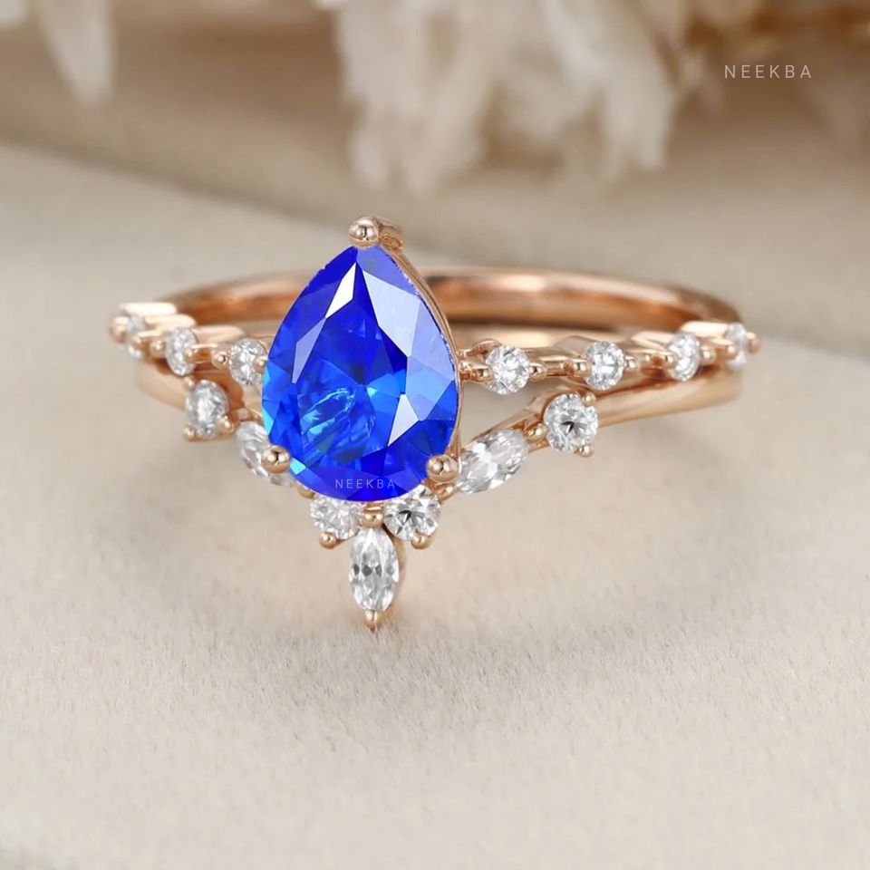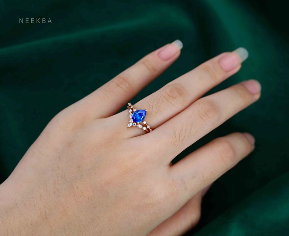 Bague de fiançailles saphir à facettes Waterdrop Lab & bande de moissanite incurvée en V, bagues fines en saphir bleu fait à la main en or rose massif 10 carats