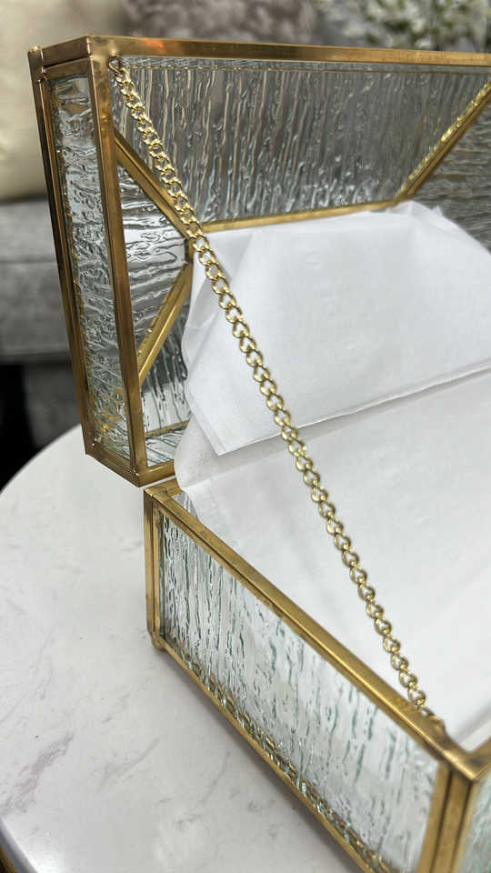 Boîte à mouchoirs en verre cascade avec jante en laiton doré vaisselle fantaisie décorative à la main en gros boîte à mouchoirs en verre