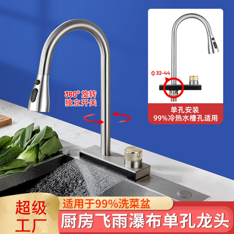 Robinet de cuisine cascade monocommande à montage sur plan, rotation à 360 degrés, cartouche céramique, finition Gunpowder