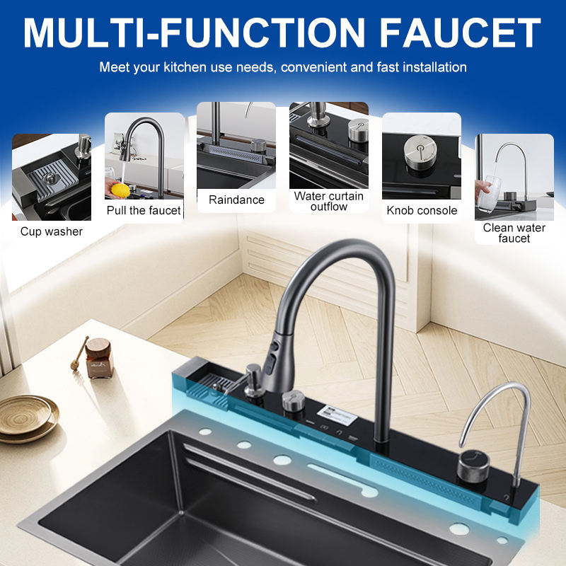 Ensemble d'éviers de cuisine cascade en acier inoxydable 304 Nano Home Sink Bassin à légumes avec robinet extractible
