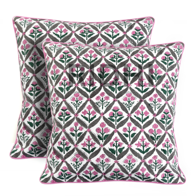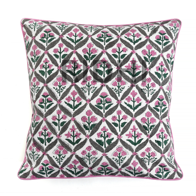 Housse de coussin en coton imprimé bloc de main rose pastèque avec passepoil | Housse de coussin 100% coton pour canapé, lit et décoration intérieure