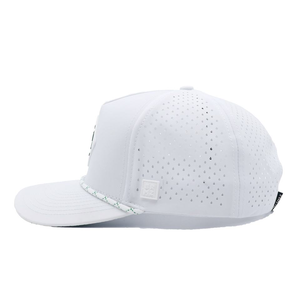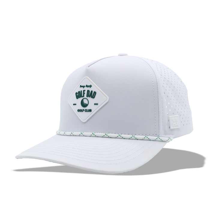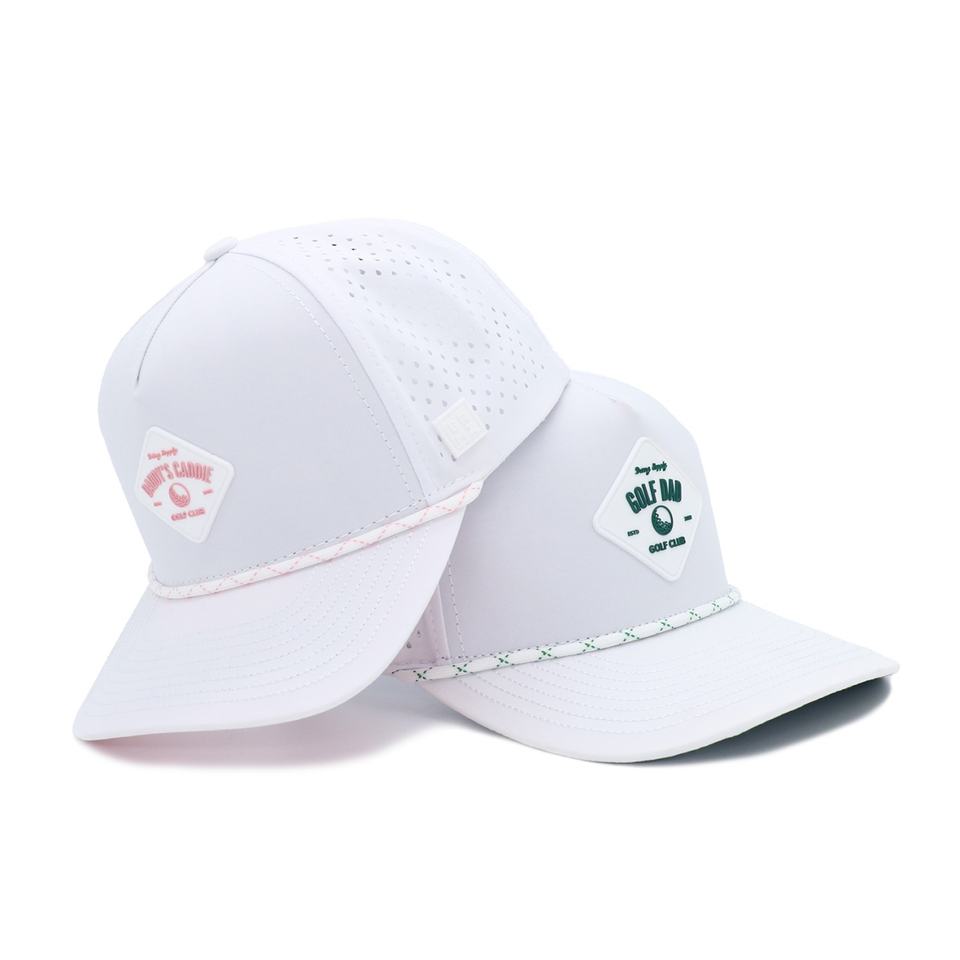 Casquette de golf imperméable à 5 panneaux avec patchs en caoutchouc personnalisés, motif imprimé Performance Rope, visière incurvée pour hommes et femmes
