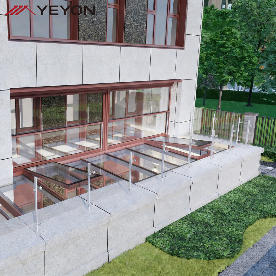Puits de lumière contemporain étanche et écologique pour sous-sol, avec cadre en aluminium et couverture en verre trempé, idéal pour l'extérieur des villas et chambres.