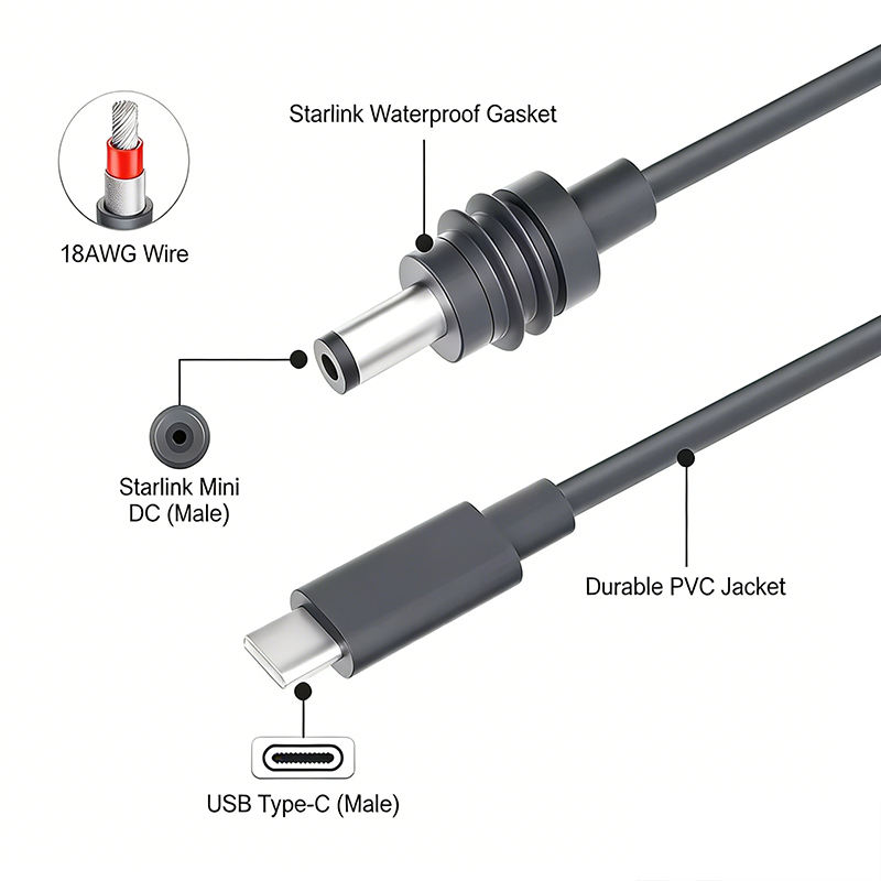 Câble d'extension satellite tressé étanche en PVC avec prise d'alimentation USB Type-C DC 5521 pour utilisation informatique et réseau Starlink