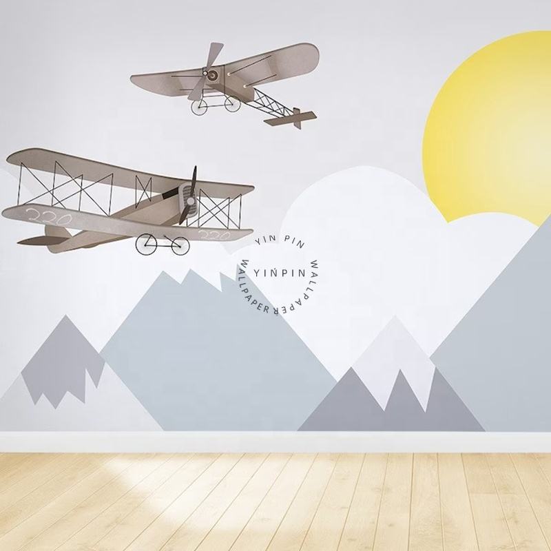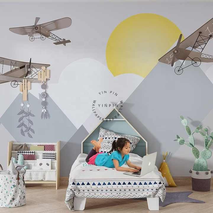 Imperméable à l'eau Peel and Stick 3D Design Enfants Papier Peint Avions Triangle Montagnes pour Pépinière pour Salon Décoration