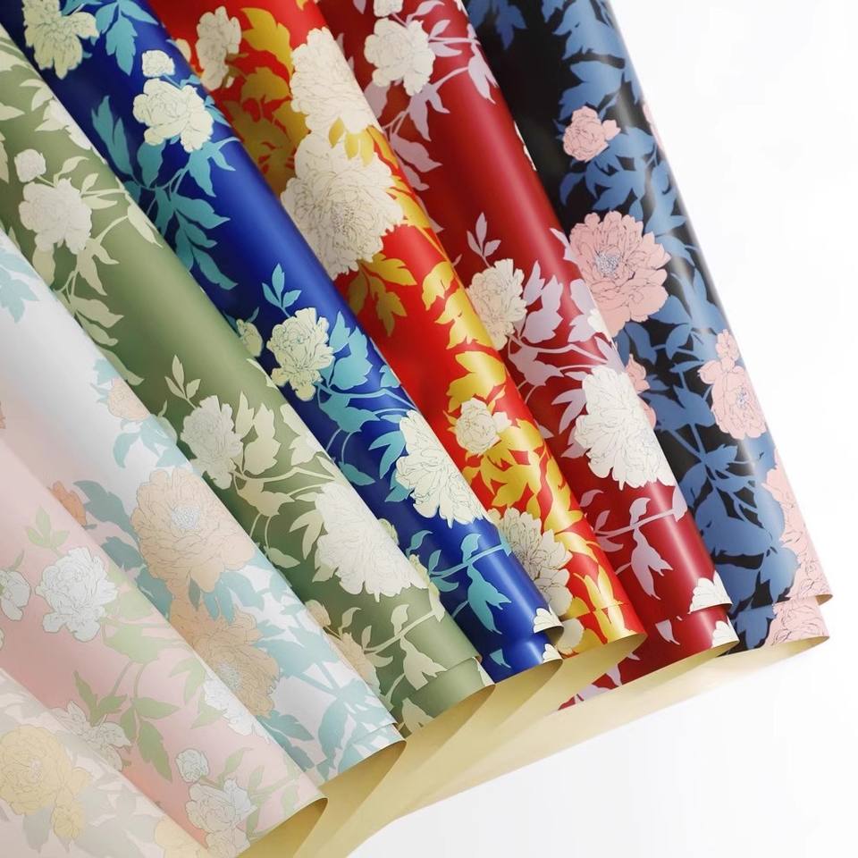 Papier d'emballage de bouquet de fleurs fraîches rétro imperméable matériau épaissi avec motif de pivoine de couleur nationale enduit de PE pour fleuriste