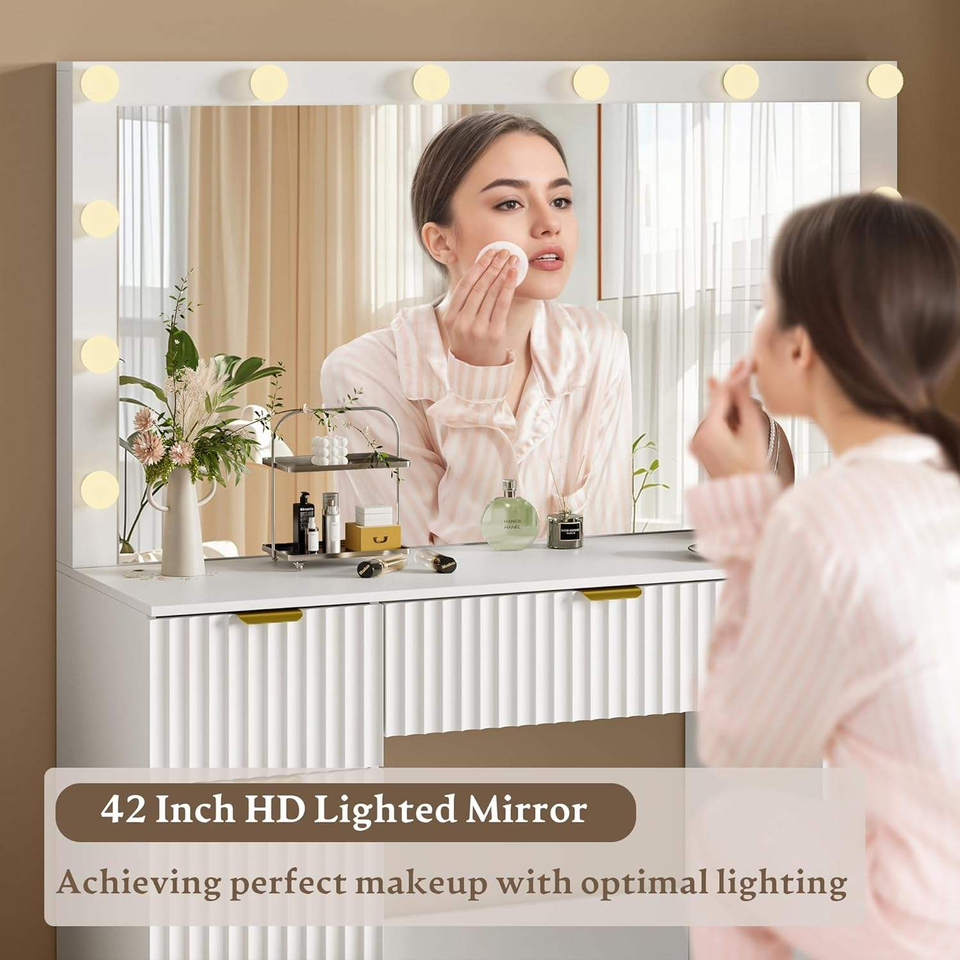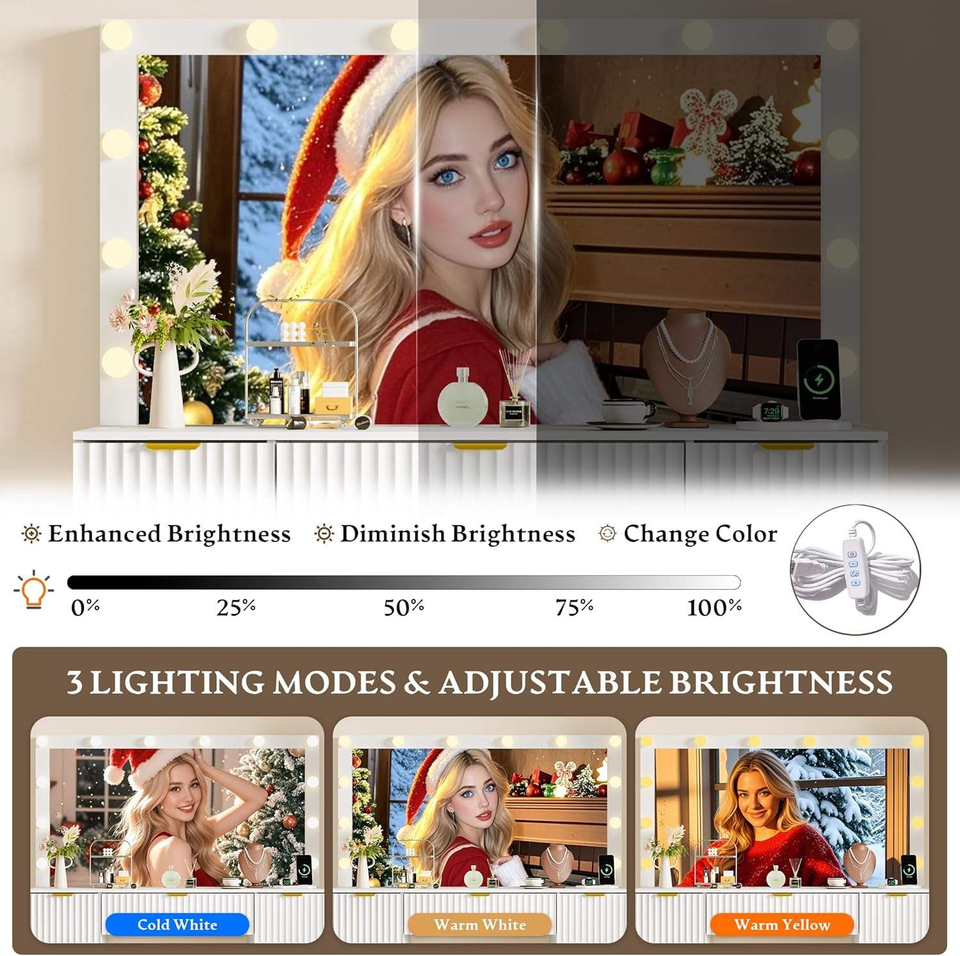 Miroir de coiffeuse à motif ondulé avec éclairage LED, 3 modes d'éclairage, luminosité réglable, ensemble de coiffeuse avec tiroir de rangement