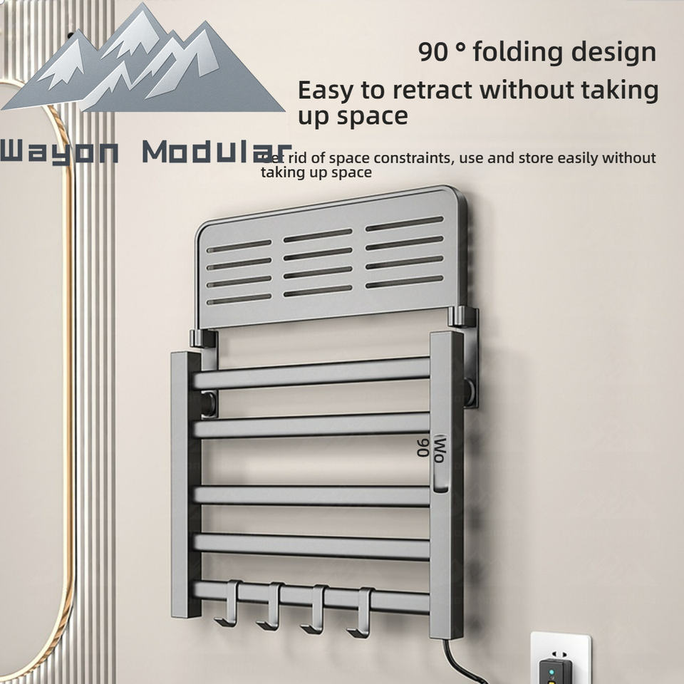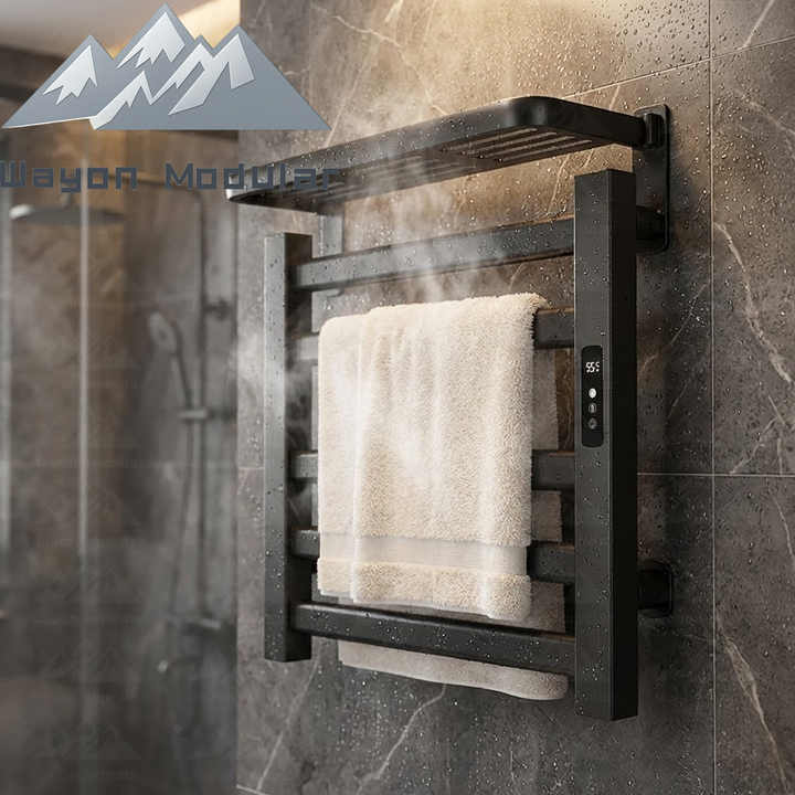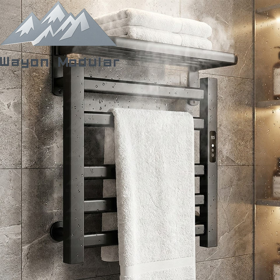 Sèche-serviettes électrique chauffant Wayon Luxury Smart, noir mat, avec minuterie LED et étagère pour salle de bain moderne