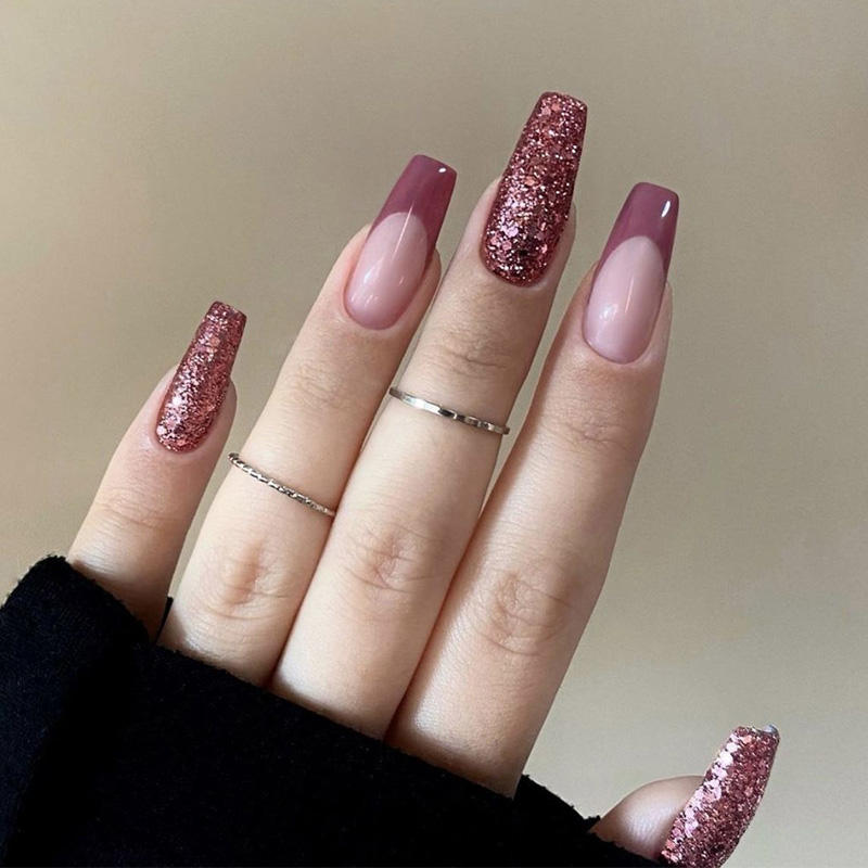 Ongles de Mariage et Fiançailles Faux Ongles Longue Tenue Design Press-on Feuille d'Or Paillettes Luxe pour Femme Réutilisables
