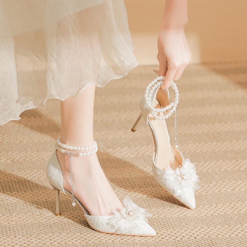 Wedding Shoes Women Bridal White Main High Heels Rhinestone Single Shoes Pointed Toe French Temperament Lace Shoes